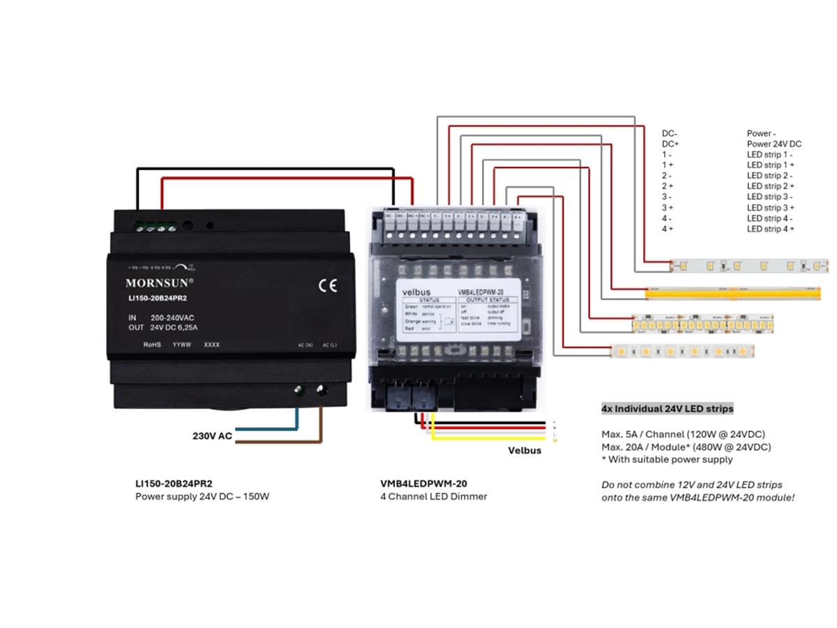 • Aanpasbare stroomlevering: Met elk kanaal dat tot 5A stroom kan leveren, voedt u uw 24V LED-strips tot 120W of 12V strips tot 60W, en biedt dit een oplossing voor veeleisende verlichtingstoepassingen.