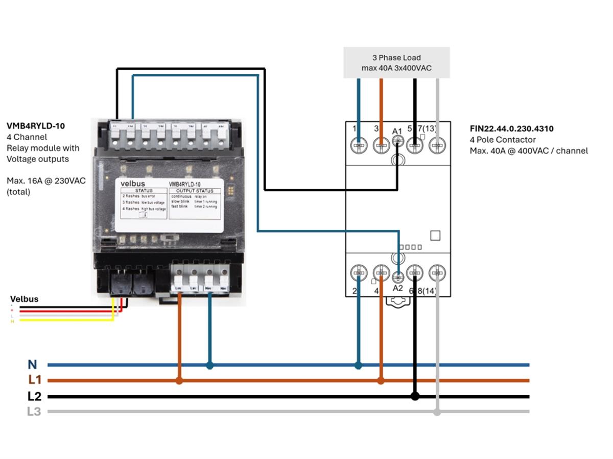 *Velbus raad de Finder 22.32.0.230.4340 aan voor 2-polige schakelingen tot 25A en de Finder 22.44.0.230.4310 voor 4-polige schakelingen tot 40A.